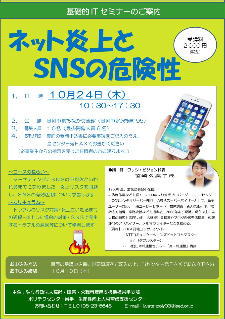 この研修はポリテクセンター岩手のオープン講座として開催されたもので、以下のチラシで参加者が募集されました。
