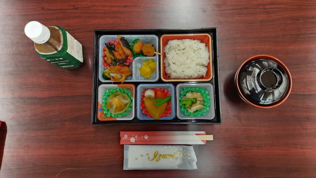 この日はサバとチキンカツ、シュウマイ、つくね串、厚揚げの煮物や大根の煮物など、和食中心のおかずがバランスよく詰まった幕の内弁当でした。