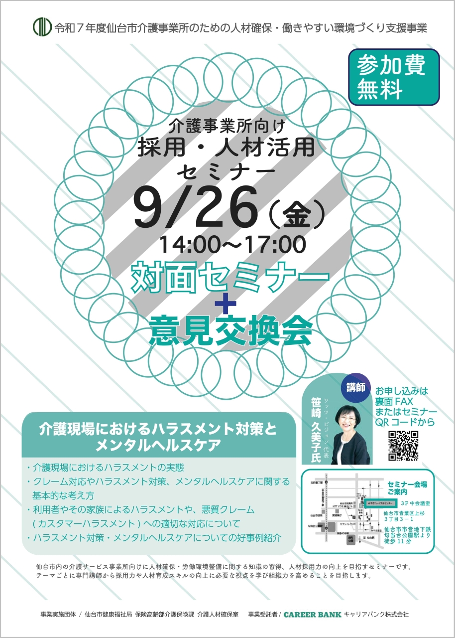 2025.09.26㈭『介護現場におけるハラスメント対策とメンタルヘルスケア』(宮城県仙台市)_h1280_2025-0926_flyer_fr 2025年9月24日 最終更新日時 : 2026年2月9日 笹崎久美子 FacebookXBlueskyHatenaCopy