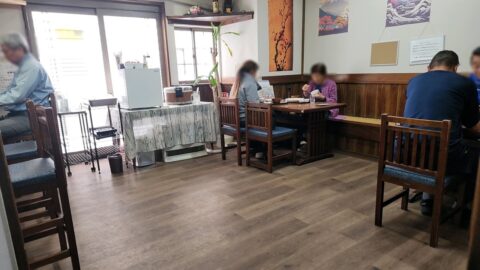 入口は正面・・・ではなく、お店の脇から入ります。意外に奥行きのある敷地のようです。間口が狭く奥行きがあるのは昔の街道沿いに建てられた商家の特長ですよね。一般家庭の玄関のような入り口で靴を脱いで上がり、廊下を進むと飲食スペースがあります。