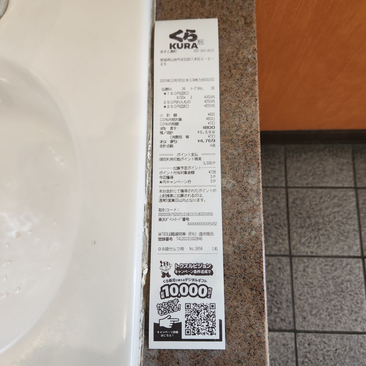 今日の研修は昼で終わるお仕事だったので、帰りにくら寿司あすと長町店に立ち寄りました。