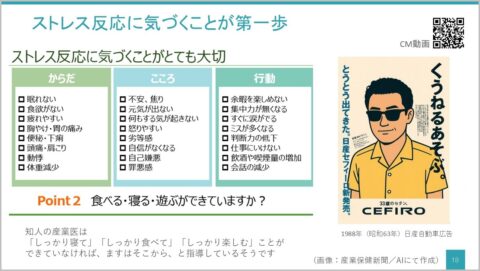 今回の研修で使用しているスライドの一枚です。産業保健新聞様のサイトから、自分のストレス反応に気付くためのポイントして「食べる・寝る・遊ぶができていますか?」と書かれた画像を引用させていただきました。