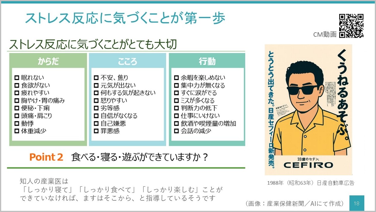 今回の研修で使用しているスライドの一枚です。産業保健新聞様のサイトから、自分のストレス反応に気付くためのポイントして「食べる・寝る・遊ぶができていますか?」と書かれた画像を引用させていただきました。