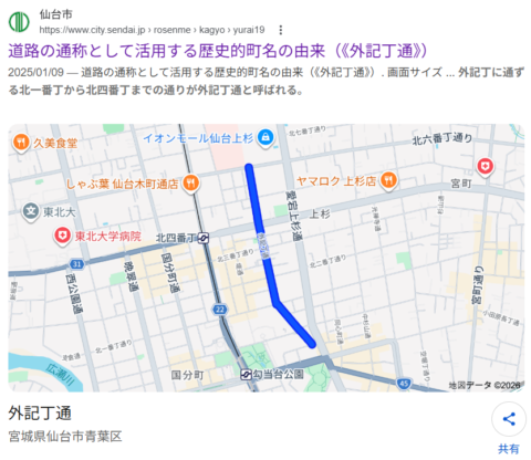 外記丁通というのは仙台合同庁舎A棟の東側の道(セブンイレブン 仙台本町3丁目店の裏口がある)付近だけを差すのかと思っていたら、北四番丁までずっと伸びている道だったんですね。(私は太白区民なので常に視点が南から北向き)