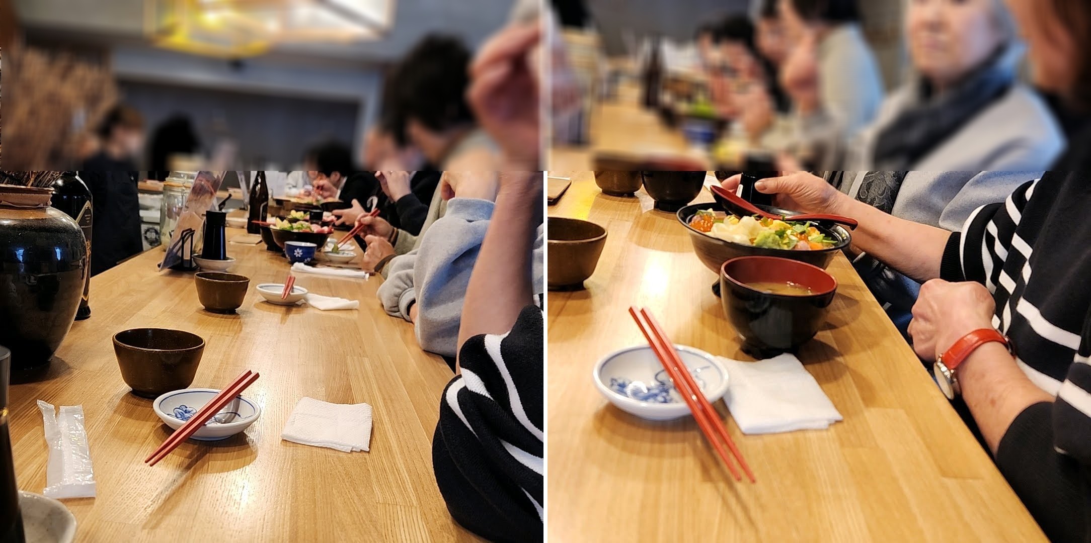 余談ですが、追加のお醤油を差すときに、卓上の醤油さし(容器)とお皿(受け皿)がくっついていて、手に持ったらそれが離れて大きな音が出てしまいました。隣の方(女性)に「すみません」と謝ったら、「いいの、いいの、私もしょっちゅうやるから」と笑って言っていただきました。
