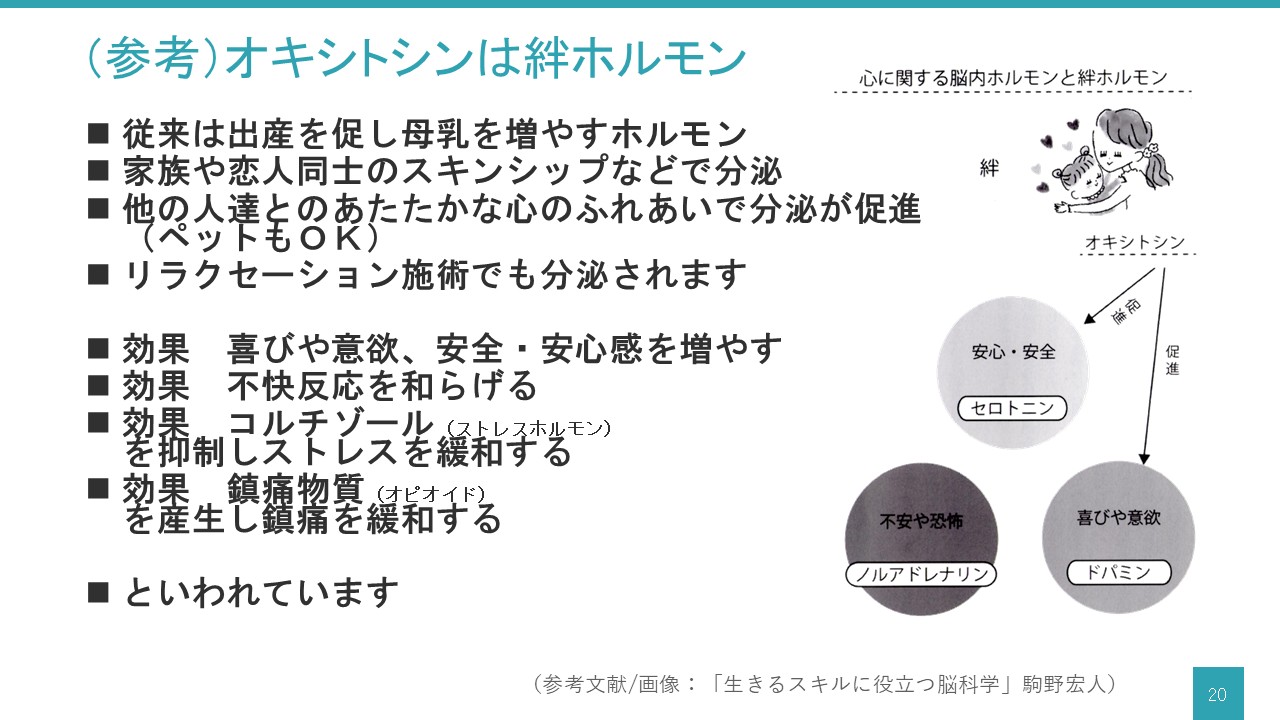 この研修では毎回、駒野宏人先生(執筆時:岩手医大薬学部教授)の「生きるスキルに役立つ脳科学」からオキシトシンについて少しだけ紹介をさせていただいています。駒野先生はコーチングを通じた知人でもありますが、この本の内容が私にとって非常に参考になったので、著書が発行された時期に先生のご了解を得て、以後、時折研修で使用しています。