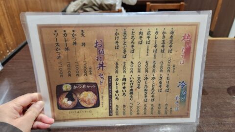 普通の町そば屋さんなので決して「こだわりのそば」という感じではないのですが、その割にはほんの少しそばの香りが感じられると前回感じていたので、今回、あらためて麺をよく見て見ると麺に黒い粒々が混ざっています。これはたぶんそばの皮ごと粉を挽く”挽きぐるみ”という粉を使っているおそばなんですね。だから香りが少しあるのかな。
