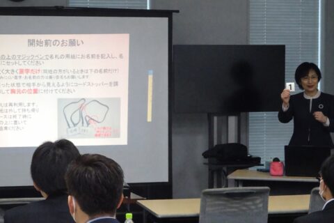 動画が問題形式になっているため、その都度番号カードを掲げて指名をして答えていただくのですが(参加者には事前に番号札を配布済み)、自分の番号が呼ばれてもお返事がなかったり手を挙げてくださらないと、その方がどこにいるのかさっぱりわからず、何度か「〇番の方、どこですか?」と呼びかけました。