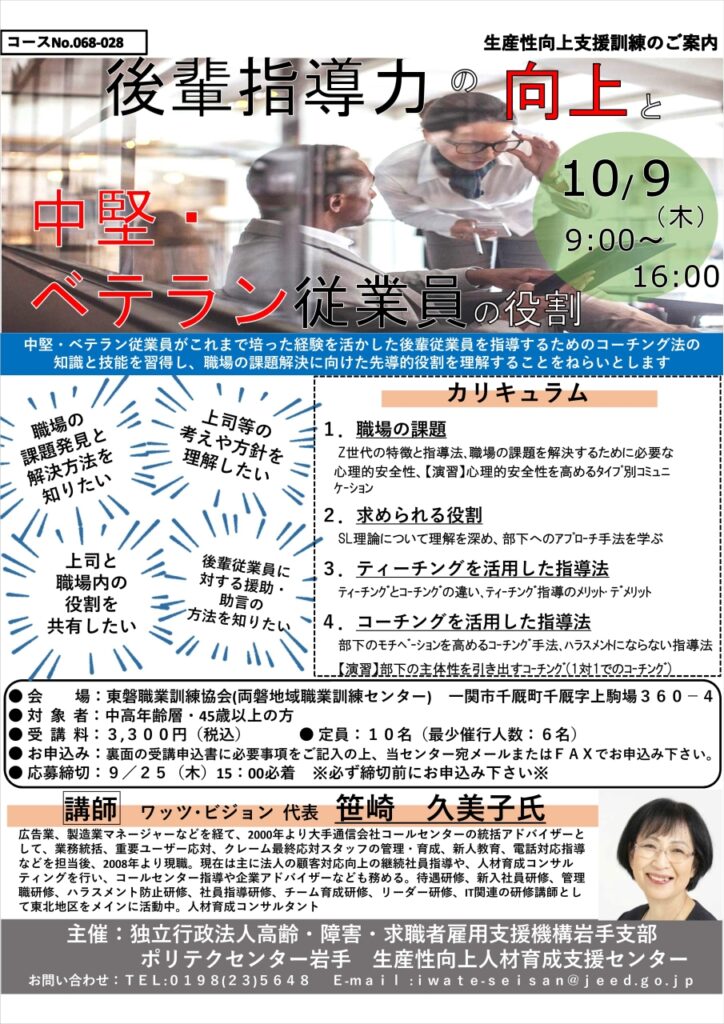 ![]() 2021.9.16山形産業保健総合支援センター様主催【Web研修会】第140回産業メンタルヘルス研修会『ハラスメント防止の基本』 | ![]() 2021.9.7一関市様主催『HPを活用した企業の魅力を伝えるPR方法について』 | ![]() 2021.7.14ポリテクセンター岩手様主催 『組織力強化のための管理』 |