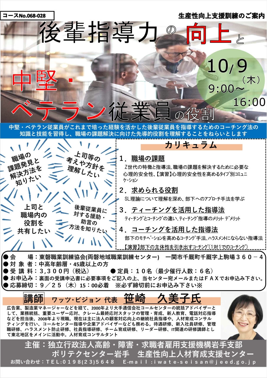2025.10.9㈭『後輩指導力の向上と中堅・ベテラン従業員の役割』(岩手県一関市)_h1280_fr_a1744000928368_1 2025年8月30日 最終更新日時 : 2025年8月31日 笹崎久美子 FacebookXBlueskyHatenaCopy